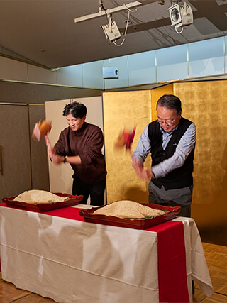 そして皆の掛け声とともに、「ヨイショ、ヨイショ、ヨイショ~!」の声で鯛の塩釜焼を割り、新たな門出をお祝いしました。