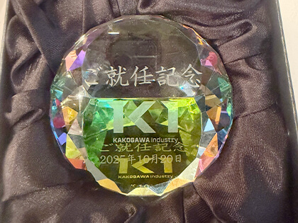 豪華なケーキと、記念のペーパーウエイト・名刺入れ。